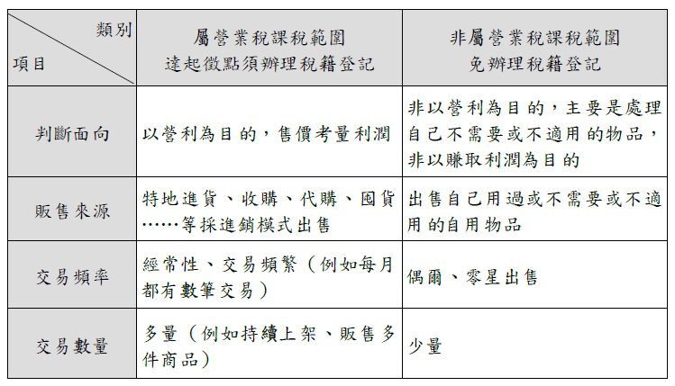 個人於網路銷售二手貨物如何判斷是否屬營業稅課稅範圍如下表: